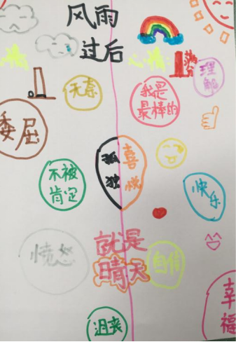 地用绘画来表现自己的心情。同学们在绘画的过程中充分地感受自己,表达自己,将活动的氛围推向了高潮。孩子说画画的感觉真好啊,可以尽情地表达自己的心情,很放松!很兴奋!