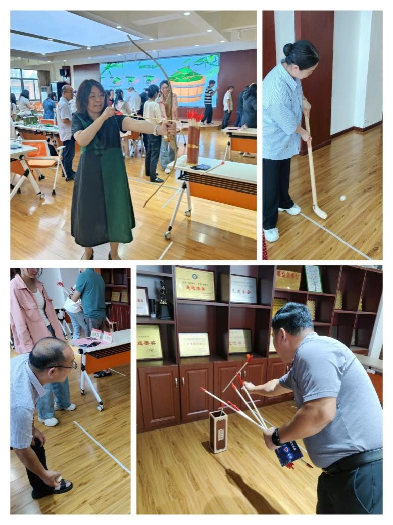 传统运动项目体验环节中,老师们纷纷体验了投壶、木射、捶丸和射箭,老师们互相鼓励,传授技巧,感受传统娱乐项目带来的乐趣,在游戏中加深了大家对中华传统文化的理解和热爱。