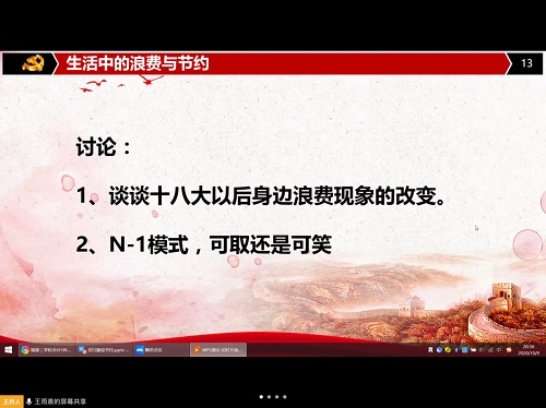 全体研究生党员参加了此次会议。本次组织生活会采取线下学习和线上讨论相结合的形式。在会议之前,党小组在研究生党员群里发放资料,要求各位党员学习纪委监察信息半月汇编、党政机关厉行节约反对浪费等相关文件。各位党员同志积极响应,认真学习。会议以“厉行勤俭节约,反对铺张浪费”为题,分为弘扬传统美德、生活中的节约与浪费、杜绝攀比现象三个板块。