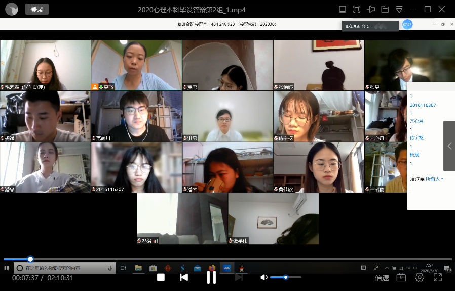 为深入贯彻落实教育部和四川省教育厅应对新型冠状病毒肺炎疫情防控工作要求,按照学校通知,应用心理学专业2020届本科生毕业设计(论文)校抽样答辩、院级抽样答辩在腾讯会议平台如期顺利举行,答辩采取学生线上答辩,评委线上评阅的形式。本届答辩委员会主任由陈华教授担任。