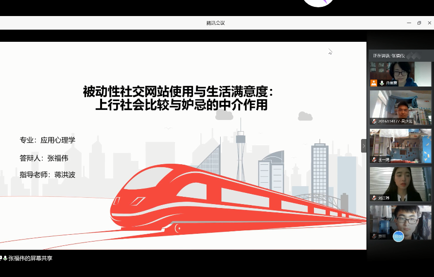 应用心理学专业2020届本科生毕业设计(论文)院级答辩如期在在腾讯会议平台举行。答辩学生以屏幕分享的方式向各位评委老师和其他同学展示自己毕业论文,并介绍包括选题意义、文献综述、研究方法、研究结果、讨论分析、结论与研究不足等内容,充分展示出自己大学四年的学习成果。
