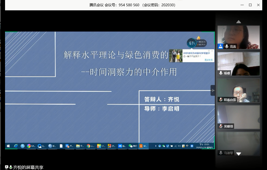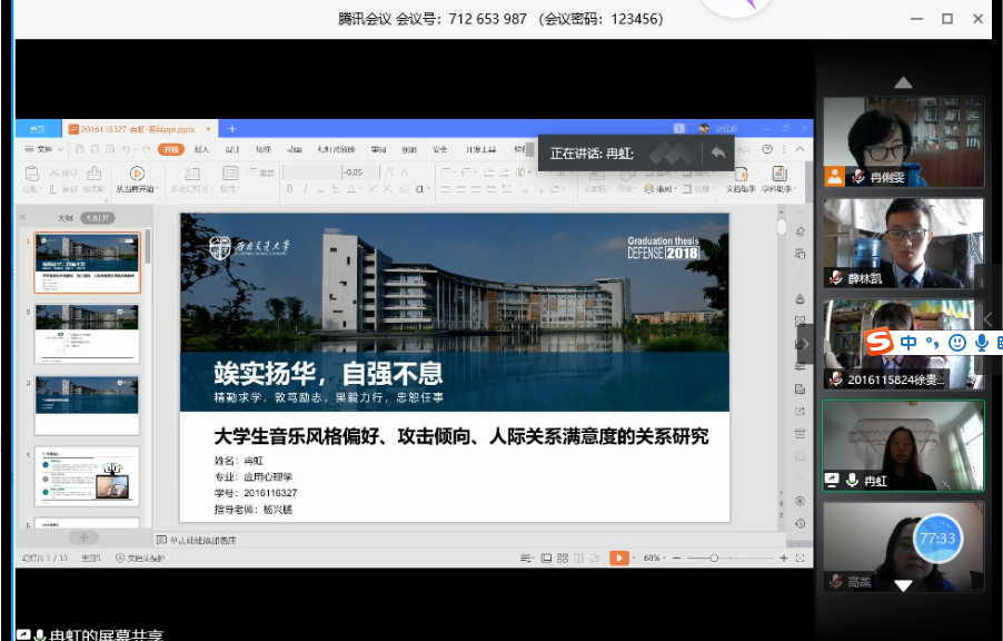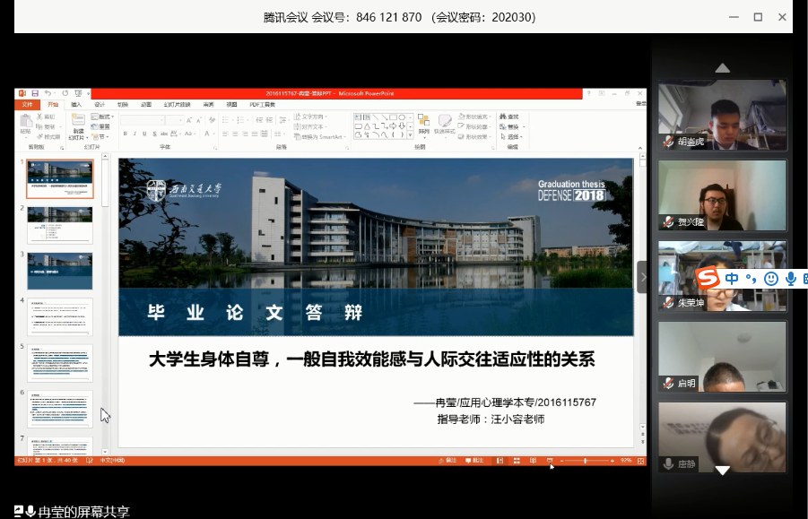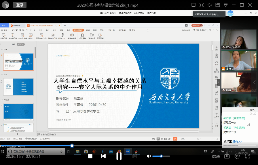应用心理学专业2020届本科生毕业设计(论文)校抽样答辩在腾讯会议平台如期举行。答辩委员会主任陈华教授担任组长并全程参与,雷鸣、汪小容、张学伟、董洁、杨兴鹏、曾毅、冉俐雯(秘书)作为评委参与答辩,顾卓然、任小佳、徐贵娟、冉虹、薛林凯5位同学参加校级抽样答辩,院级各答辩小组长、教师代表、应用心理学2020届全体本科生、双学位学生通过线上会议旁听答辩。