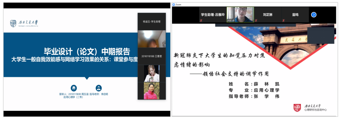 当天下午,77名本科生被分为五个小组同时进行中期检查。无论是校级检查,还是院级中期检查,每位同学通过分享屏幕,讲解PPT的形式进行报告。在5分钟陈述后,评委老师逐一进行提问,帮助同学们完善毕业论文。同学和老师通过空中连线,实时进行跨空间的指导。