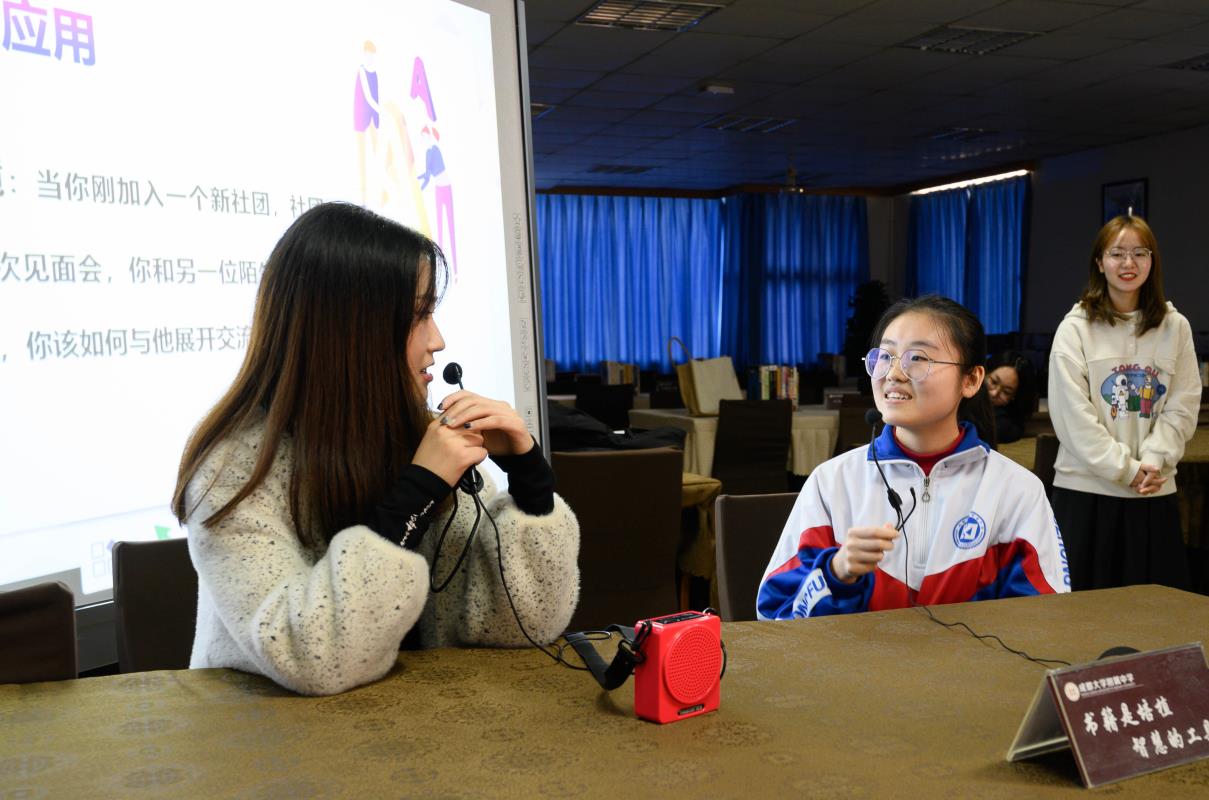 当天下午,科普基地“科学第一课——走进校园”活动的七名学生志愿者(吕雅玲、蔡雅静、李睿淇、李丙龙、齐子行、彭福焮、张浩男)在唐静老师的带领下来到成华区成都大学附属中学开展活动。活动中,吕雅玲首先带领同学们进行了热身小游戏,同学们在预先准备好的卡纸上写下个人特征,再由其他人进行猜测,在此过程中加深了对自我的认识和对同班同学的了解,同时也引出了本次活动的主题——人际吸引力。随后,蔡雅静上台为同学们详细讲解了吸引力的相关知识,她指出:“吸引力产生的关键在于他人的出现对于个体具有奖赏作用,而临近、熟识、长相、性格、文化、态度是影响人际吸引力高低最重要的六点因素。”同学们在在台下听得聚精会神,不时做着笔记,表现出了浓厚的学习兴趣。最后,活动进入情景演练环节,由科普基地团队和高一(一)班各出一人,共同完成一次五分钟的见面谈话,在此过程中,演练者从拘束紧张到放松自然,从小心翼翼到大方得体,用实际行动应用了本次活动所讲授的知识点。