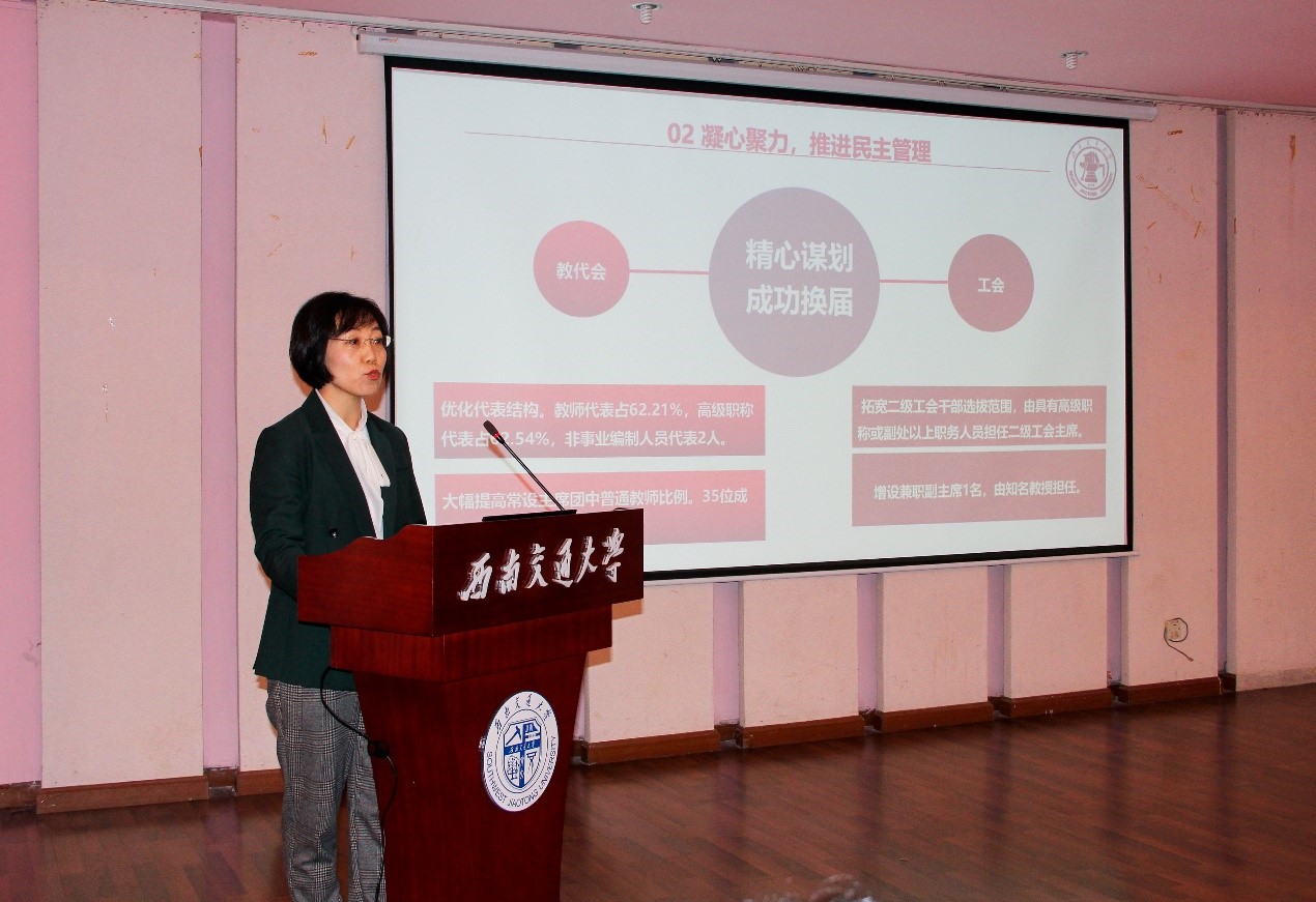 当天下午,会议进入第四阶段,四所交通大学的二级部门工会主席就学院层面的工会工作进行了研讨交流:上海交大机械学院工会孟雁主席作《服务院为实体,发挥工会作用》,西南交大原3d色情