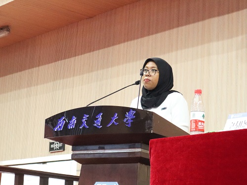 交通运输与物流学院硕士研究生法蒂玛代表留学新生发言,她首先向之前在峨眉校区学习的那段期间帮助过她的师生们表达了感谢,同时表示在研究生学习生涯期间,要不断努力学习,为促进中国和印尼未来的友好发展尽自身的绵薄之力。
