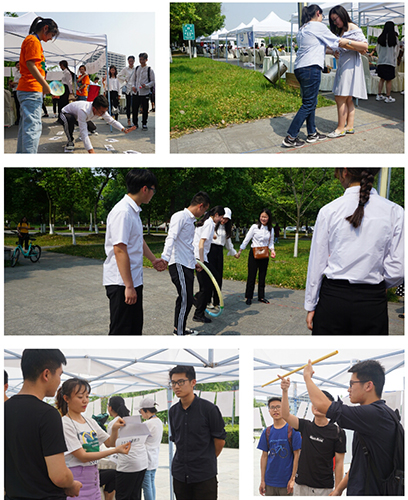 最具特色的是心理健康趣味活动,包括“撸起袖子加油干”、“青春就要大步走”、“手拉手传呼啦圈”、“合作同走独木桥”和“逆向思维”这几个不同的趣味游戏供同学们自主选择、自由参与。这些游戏考验了同学们的平衡力、团队合作能力、记忆力和反应力等。在这些小游戏中,同学们寻找着解决方法,学会与队员协调解决困难,也增进了人际沟通与协作互助。不少同学表示这种游戏的方式既轻松又愉快,成为了本次普法教育活动中的一大特色和亮点。展区还特别设立了心情墙,同学可以使用便签纸写下自己的心情贴在白板上,也可以用彩笔直接在白板上进行绘画,通过合理的方式来表达或宣泄自己情绪。