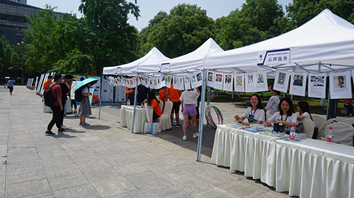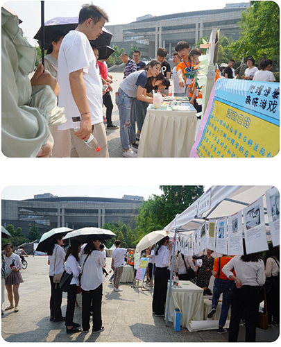心理特色活动项目包括心理知识展示宣传和心理健康趣味活动两部分。展示宣传部分中,一排心理健康知识的宣传牌和33张心理健康图片展示在路旁和帐篷上,吸引了不少同学前来观看学习。