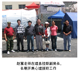 宁维卫、曾毅、唐静和黄祥四位老师第一时间亲临灾区开展调研和心理援助工作。杨兴鹏老师受省委组织部委派,作为首批8位心理专家、党员突击队成员,赶赴芦山灾区开展心理干预工作,在雅安天全县灾区开展了有效的心理救援工作。