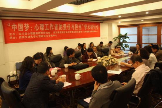 联合主办的“中国梦:心理工作者的责任与担当”学术研讨会在成都顺利举行。来自成都大学、宜宾学院、西南财经大学、西南民族大学、电子科技大学、四川师范大学、成都理工大学、西华大学、四川水利职业技术学院、四川建筑职业技术学院、西南交大峨眉校区等11所省内高等院校心理健康教育工作相关负责人与会并参与研讨。