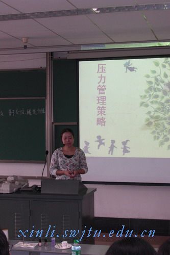 高飞老师讲课的题目是《压力管理策略》。高老师说,现代生活的快节奏让我们都倍感压力,但“我们不能也不应该消灭自己 的压力,而是要学会享受它”。高老师的授课方式别出心裁,她运用“五感(视、听、嗅、味、触)减压模型”的放松技术,让听课者亲身体验,带领大家仿佛走出教室,进入充满鸟语花香的大自然。那种意境用一位老师的话评价就是“鸟鸣山更幽,山泉石上流”。