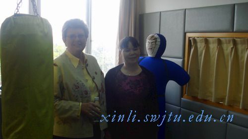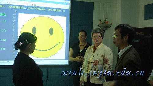 在实验室,陈主任向他们一一介绍了各个功能实验室设备情况、主要作用、使用情况、在学生中的影响等。Dr. Lee Bird等一行人对实验室所拥有如此多先进设备十分惊讶,也很有兴趣。当听到我们中心建立的“心力网”和“心援网”面向学校学生以及面向全省进行心理服务时,Dr. Lee Bird向我们伸出了大拇指,称赞我们的作法很有创意。在情绪宣泄室和生物反馈实验室,他们也不放过亲身体验的机会,纷纷上前试一试。在参观的同时,双方还就教师队伍、教学与心理咨询等问题进行了交流。