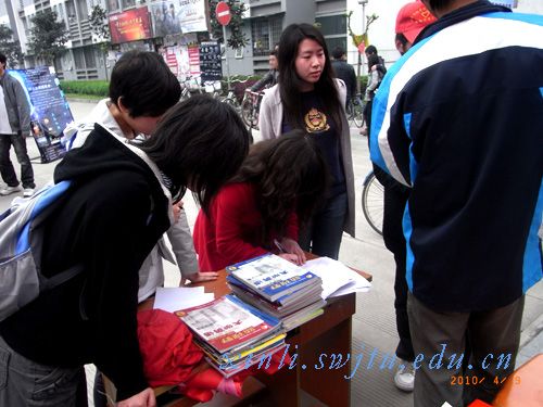 4月9日中午,土木青协在西南交大四食堂门口设立了现场募捐点。记者在现场看到有的班级集体募捐。土木青协先锋队四队的任勇解释道,“由于前两天已经收到不少图书,今天以个人名义来捐书的同学不会很多。但我们在走访宿舍的时候,着重向班委宣传过“爱心书屋”活动,并号召他们以班集体的名义集体捐书。得到了很多同学的积极响应。所以,今天会有不少同学把自己班里募集到的书带给我们。”的确,活动开始不久,两位人文学院07级法学二班的同学来到募集点,以班级的名义捐出了两袋旧书。随后,前来捐书的同学更是络绎不绝。