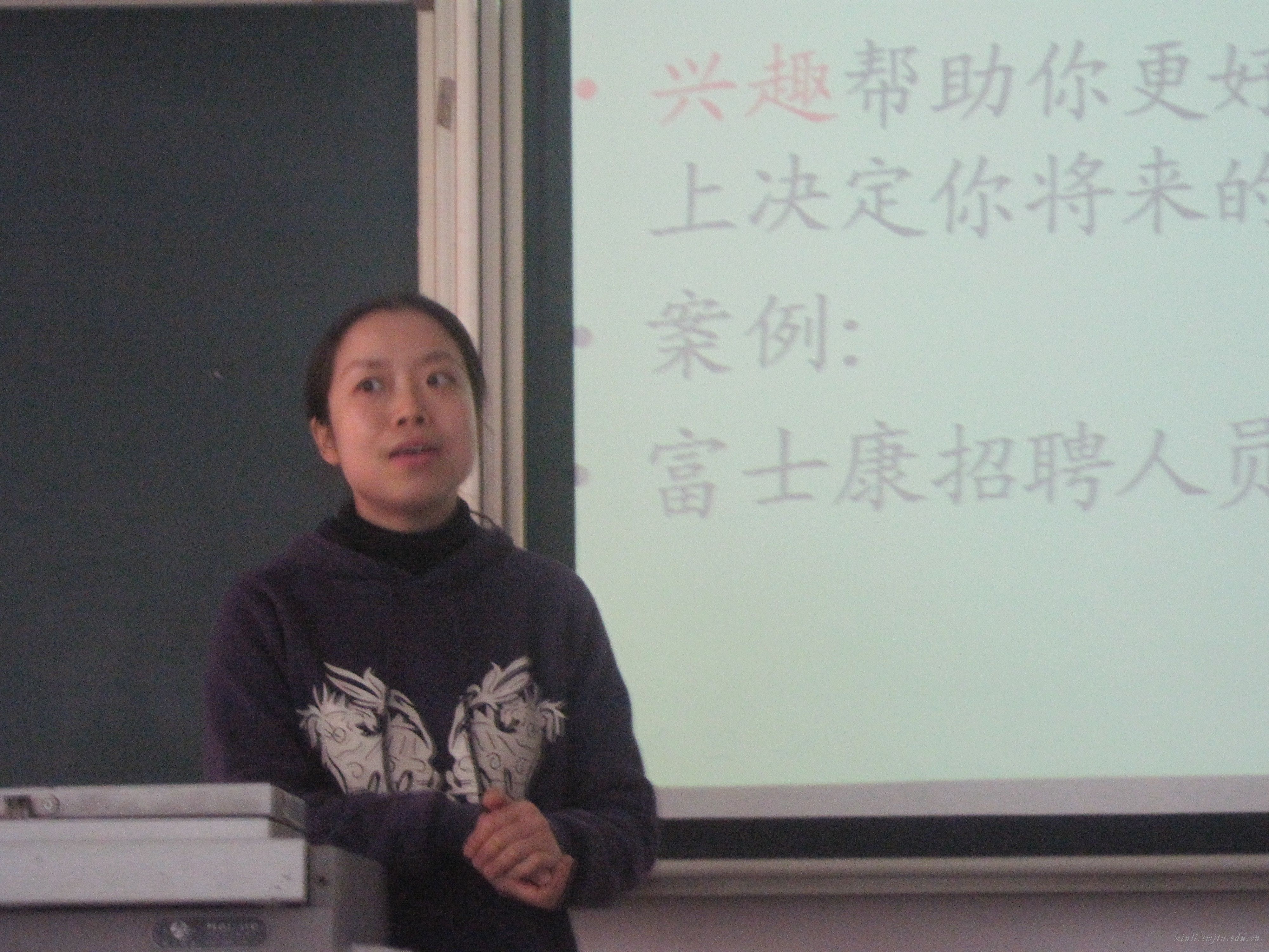 上午十点半,演练正式开始。首先上台的是高飞老师,高老师的课题是“大学生择业心理辅导”,从兴趣方面讲解职业心理的重要性。首先,高老师通过名言引出讲课主题,总述了解自己职业兴趣的重大意义。接着以学生耳熟能详的名著中的人物为例,分析了“研究型、企业型、社会型、常规型、现实型、艺术型”六种典型人物性格特征中的优势、缺陷以及他们的就业趋势,让同学们对比自己的性格,了解自己的就业兴趣,在大学阶段就对自己的职业有所了解与规划。最后高老师以“鸡蛋、胡萝卜、咖啡豆在沸水中煮十分钟”的小实验收尾,希望同学们能像咖啡豆那样完全融入职业中,做到“选择你喜欢的,喜欢你选择的”。