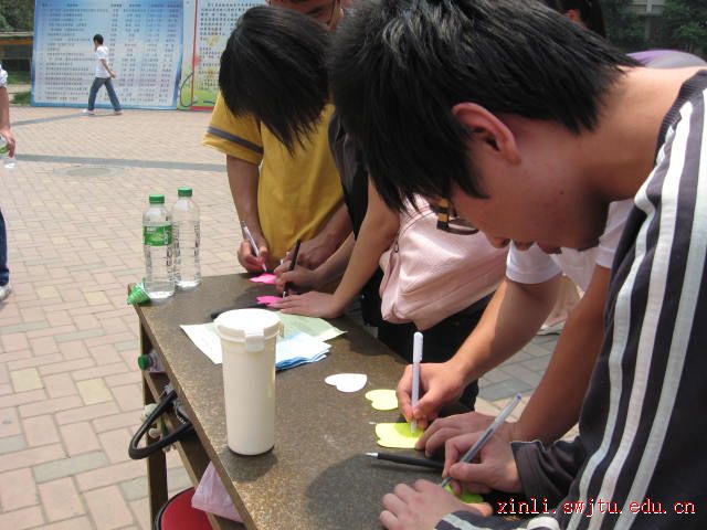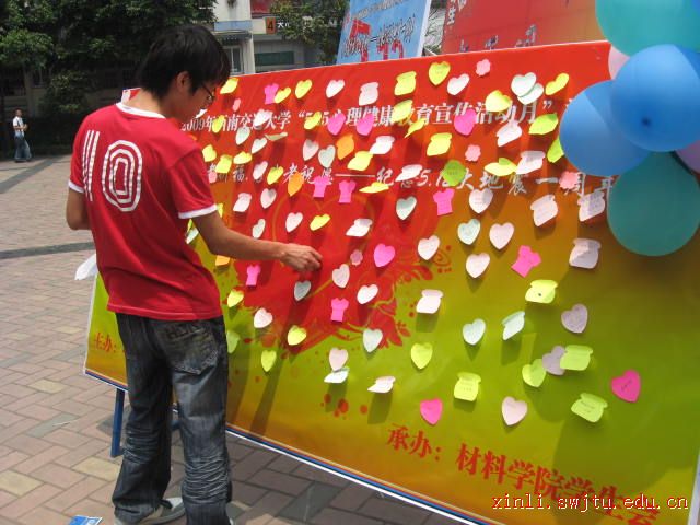 5月11日中午11:00,材料学院在南区一食堂前开展纪念5.12地震一周年活动。 2009年5月,是3d色情 5.25心理健康教育宣传活动月。本次活动是其中之一,名为“为逝者祈福,为生者祝福——纪念5.12地震一周年”,由3d色情 主办,材料科学与工程学院承办。据悉,材料学院将近两三天持续举办这个活动。 活动中,路过的同学经工作人员热情介绍,都积极提笔,述说对5.12的感慨,对四川的祝福,对生命的感悟。“期年未满,恍如隔世;多难兴邦,祖国安康”,“我们承受的灾难,让我们明白更多的责任”,“没有一个冬天不可逾越!愿逝者安息,生者坚强”,“祭奠逝者,让生命更加光辉”,“有爱就有希望,有希望就不要放弃”……一句句发自肺腑的话语,表达的是心声,是交大学子的祝福。 这次活动在13:00结束,大大的两块展板已经贴满了承载者交大学子的祝福的便签,在灿烂的阳光下熠熠生辉。