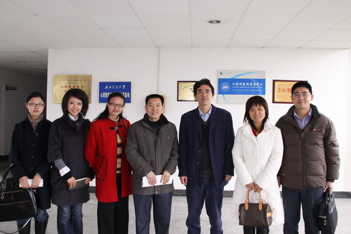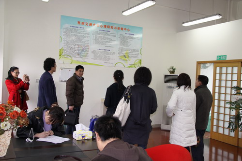 建设、发展以及工作等情况,然后参观了我校心理咨询室,了解我校开展心理咨询工作的情况,学生心理健康状况等等。随后又在宁教授的带领下参观心理测评与咨询实验室。在实验室,宁教授为老师们详细地介绍了各个实验室功能、使用方法、效果等。老师们对实验室的各种设备十分感兴趣,纷纷向宁老师咨询、提问,并亲身体验了各种设备的训练方法,对实验室的建设大为赞赏。宁主任还为他们介绍实验室建设发展方向。他说,中心正逐步致力音乐及艺术方面的心理治疗,拓展在这方面的研究。同时尝试在全国建立心理咨询与研究联盟,由各大学参与建立一套综合的咨询与研究系统,以促进国内此方面水平的提高