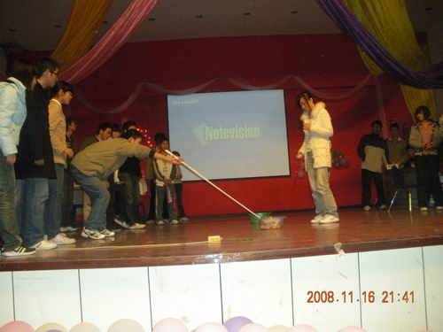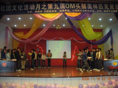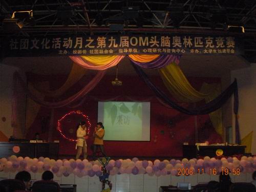 伴随着激扬的音乐,以及上一届OM大赛精彩的照片剪影播放。第九届OM头脑奥林匹克竞赛于2008年11月16号晚上7点在一食堂三楼隆重拉开了帷幕。本次参加决赛共有6个代表队,分别是:动车组队,环进队,牛人队,3+2队,闪电飞刀队和天之彼岸队。