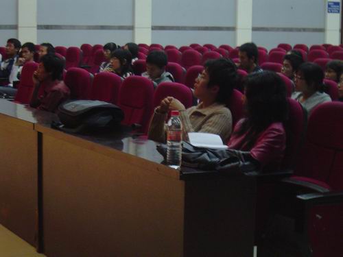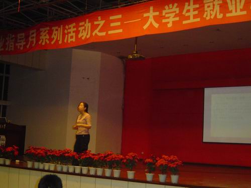 首先,她讲了关于求职择业的心态。她问道,找工作,你准备好了吗;打算将来有一种什么类型的生活等话题来与学生进行交流。她又讲到关于求职的一些应意的事,并问道你有一个计划吗?想想自己的关系网;想想自己的简历——叩开就业大门的第一步;要树立良好的个人形象;适当的时候还要与心理测试过过招。在这些环节中,高老师始终与同学们进行着交流。