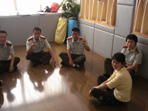 接下来所有的同学们被分成六组,分别由一位辅导老师带领进行小团体心理辅导活动。5·12地震事发突然、造成的灾难大,不可避免地会对涉及地震的许多人包括抗震救灾人员造成不同程度的心理和身体影响,会造成人体的应激反应,带来消极情绪、思维混乱、行为失控等反应。首先,为了科学地评估地震对被辅导者造成的身体和心理影响,老师们为同学们分发了《地震后不同人群心理状况基线调查表》,指导其认真填写完毕后,心理辅导老师用九分格法指导国防生分享抗震救灾经历和感受。所谓的九分格法,即要求队员在一张A6纸上自行把纸分为九格,然后分别在格子里用一幅图画来表现自己在地震后及救灾中的经历和感受。很多平时很少绘画的同学在拿到纸笔后面有难色,无从下笔。但半小时过去后,每个同学还是完成了自己的作品。接下来是口述分享时间,每个国防生分别发言分享自己的抗震救灾经历和感受。尽管5·12地震已经过去一个半月了,但国防生的叙述还是让救灾现场历历在目,动情处无不哽咽失语。许多国防生觉得自己做的不够,希望在毕业后为灾区做更多贡献。在有些沉重的经历分享后,心理辅导老师们引导同学们做基于中国的静脉理论的“八点法”,目的在于治疗创伤,放松情绪。许多同学们在做完放松式的“八点法”之后感觉良好,轻松了不少。