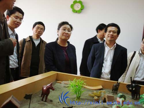 宁维卫主任向来访领导详细介绍了我校在大学生心理健康教育工作方面开展情况,并就大学生心理咨询与测评实验室建设情况作了详细解说。经过近两年时间的建设,我校大学生心理咨询与测评实验室已率先成为国内专门用于心理健康教育的开放性、创新性、实践性的综合性实验室,并在大学生心理健康测评、心理咨询以及心理健康教育研究领域发挥了积极作用。江西省委教育工委史蓉蓉副书记以及四川省委教育工委周光富委员等领导就实验室在使用、研发和创新等方面的情况进行了了解。并现场对沙盘治疗的原理进行了细致了解。沙盘治疗作为一种心理疗法,是通过对图形、沙具、摆放的顺序以及在这过程中的相互引导,交流,达到发现其“原型意象”,指导于具体的心理危机干预和治疗的方法。我校在日常的心理危机干预治疗中应用广泛,效果良好。在生物反馈实验室,来访领导亲自体验了仪器效果。我校在国内率先应用生物反馈技术开展团体训练,并应用于大学生心理疾患的治疗。来宾对我校在此方面作出的探索和创新予以充分肯定,并就实验室服务、研发等方面工作提出了建议。