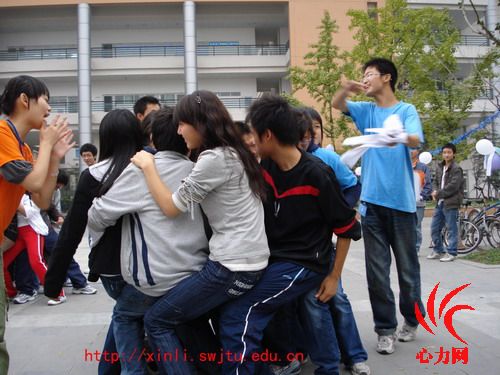 活动以一个叫做“抱团”游戏开始的。通过这个游戏一下子就帮助同学们的消除了陌生感,同学们之间的交流渐渐多了起来。第二个游戏是“夹气球”。这需要大家齐心协力,配合默契才能完成。接着的游戏便是很有意义的“盲哑人穿行”。每组的同学们手牵手,依次一个人来当盲人,一个人来当哑人,这需要彼此互相完全的信任与合作才能快速的走完规定的路线。游戏结束后各组同学都与大家分享自己的感受与心得。最后一个叫“人椅”游戏更为精彩,需要整个小组同学具有很好的团队精神。游戏的玩法是大家围成一个圈,一人坐在另一人的腿上,每个人都必须坚持着,看哪个组的人坚持最久。其中如果有一个人坚持不住垮下来,所有的人都会坐不住,人椅就会散架。当组织者喊停时,却没有一组停下来,都希望能坚持最久,获得胜利。活动中,同学们良好的合作、团结的团队精神得到淋漓尽致的表现。
