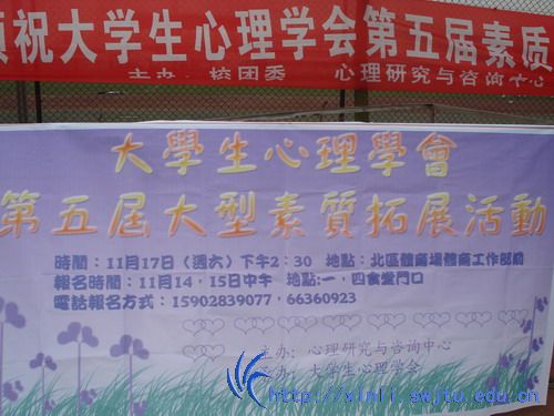 针对大学生(特别是新生)中出现人际交往困难,自卑,心理承受能力差,缺乏合作精神等现象,11月17日下午,心理学会第五届素质拓展活动在南区体育场展开。他们希望通过举行趣味性的素质拓展训练和心理小游戏,帮助参与者激发自身的潜能,重新认识自我,培养自信心,培养加强团队合作精神,提升个人交往沟通能力,激发创新意识等,更为乐观勇敢地面对来自各方各面的压力挑战,更快的适应大学生活,更快的成长成为一名名副其实的大学生。