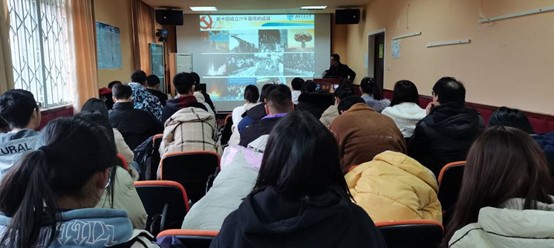柯小君副书记通过极具历史年代感的视频,生动地再现了改革开放前中国人民贫困的生活。而后,他又举出当代中国先进科技与美好生活的具体事例,使同学们深深感受到几十年来在这片土地上发生的翻天覆地的变化。柯小君副书记指出,带领中国从贫困走向世界强国的,是始终把人民利益放在第一位的中国共产党。我们新时代的青年应接过祖国发展的接力棒,坚定信仰跟党走,为祖国建设添砖加瓦。