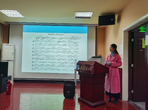 在同学们的认真听讲中,讲座很快进入了第二部分。刘老师向同学们分享了她在美国西奈山医学院访学期间的经历。例如,给亚裔焦虑患者开处方音乐、新年之际在医院开小型音乐会、治疗老年患者的焦虑情绪、将一群中风的患者组成合唱团、为当时处在疫情中的祖国祈福......这些有趣、温暖人心的经历,让在场的同学沉迷其中。