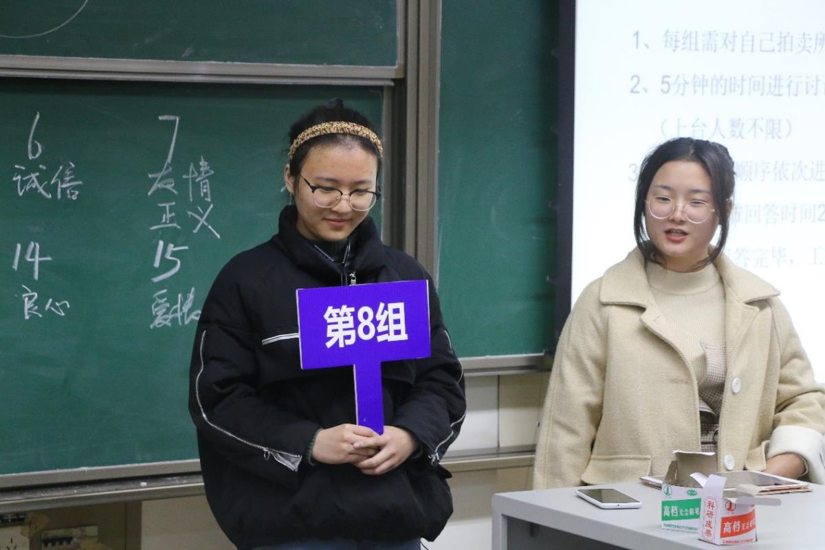首先,主持人对本次比赛的背景及意义做了简要的说明,同学们也对即将开始的竞拍环节期待满满。第一环节是“商品竞拍”环节,即采用虚拟拍卖的活动形式,给予每个参赛小组5000元的虚拟货币作为资本,对21件“价值”拍品(包括爱情、美貌、自信、良心等)进行竞拍。每件拍品500元起价,每次加价200元起,价高者获得拍品,但是每组出价总计不超过5000元。(选手在活动前并不知道“价值”出现的顺序,以及每个“价值”对应的分值。)竞拍活动非常激烈,甚至有小组为同一个“价值”不断加价,同学们的积极参与让现场的气氛也热闹了起来。