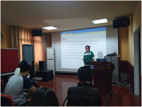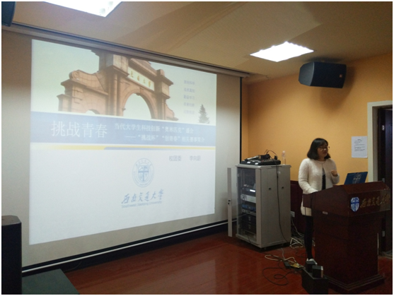 首先,由李向蔚老师为同学们详细介绍“挑战杯”“创青春”相关赛事。挑战杯是“挑战杯”全国大学生系列科技学术竞赛的简称,是由共青团中央、中国科协、教育部和全国学联、地方省级人民政府共同主办的全国性的大学生课外学术科技创业类竞赛,承办高校为国内著名大学。“挑战杯”竞赛在中国共有两个并列项目,一个是“挑战杯”全国大学生课外学术科技作品竞赛(称大挑);另一个则是“挑战杯”中国大学生创业计划竞赛(称小挑),后经改革提升,更名为“创青春”全国大学生创业大赛。这两个项目的全国竞赛交叉轮流开展,每个项目每两年举办一届。“挑战杯”系列竞赛被誉为中国大学生科技创新创业的“奥林匹克”盛会,是目前国内大学生最关注最热门的全国性竞赛,也是全国最具代表性、权威性、示范性、导向性的大学生竞赛。