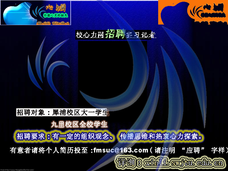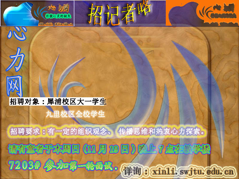 综合以上因素,心力网特面向交大犀浦校区大一学生招聘实习记者(其它年级同学若有兴趣浓厚者,可同在那天参加面试,我们同样非常欢迎你的加入),以及面向交大九里校区招聘记者。
