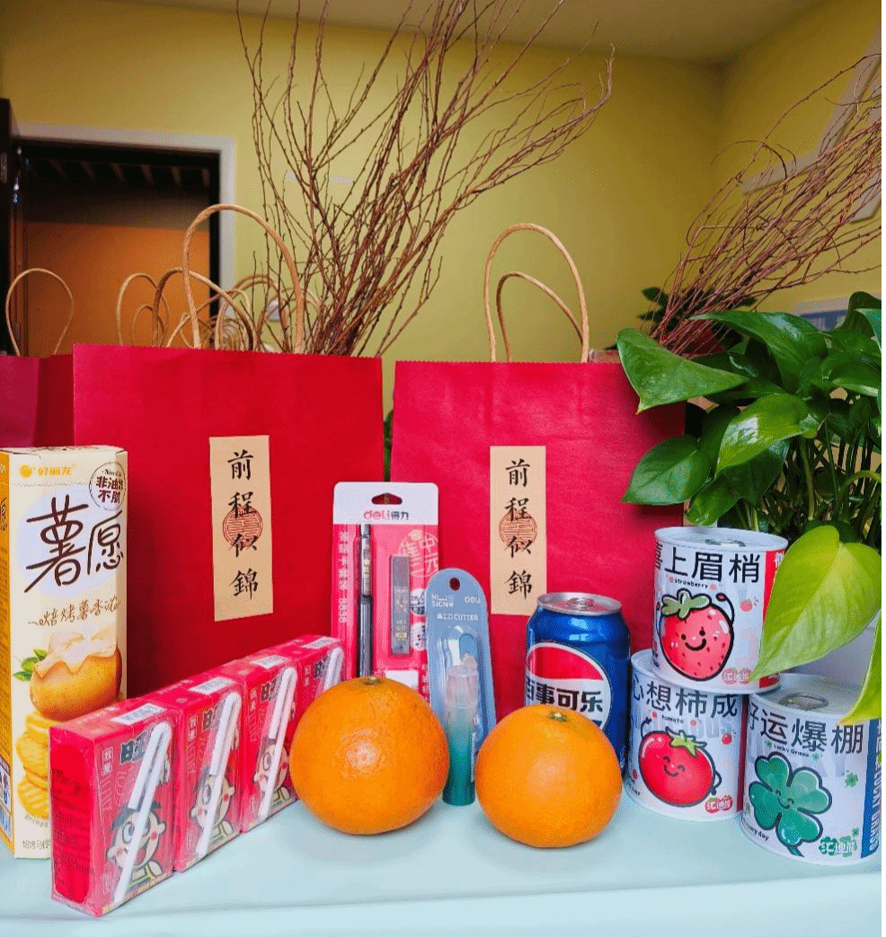 在精心准备的温暖礼包中,每一份都蕴含着特别的寓意:鲜亮的橙子寓意 “心想事成”;精美的文具套装则是实战中的得力助手,寓意“妙笔生花”;百事可乐、薯愿和旺仔牛奶,寓意着考试期间也能有好运相伴;写上祝福语的盆栽罐头,寓意着播种希望,收获未来;雪柳枝条则寓意同学们保持良好心态,静待花开。