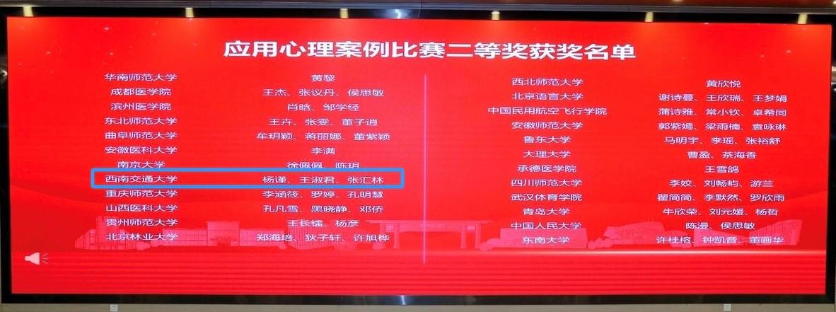 大赛共设立三个赛道:心理咨询/心理治疗面谈技能比赛、应用心理案例比赛、心理科普作品比赛。中心应用心理学专业学位研究生首次在所有赛道均获奖,斩获案例开发赛道二等奖(参赛成员:杨谨、王淑君、张汇林,指导教师:董洁、杨兴鹏、张学伟)、心理咨询面谈赛道三等奖(参赛成员:张婧萱,指导教师:董洁)、心理科普视频三等奖(参赛成员:叶娅、丁纯洁,指导教师:冯果)。