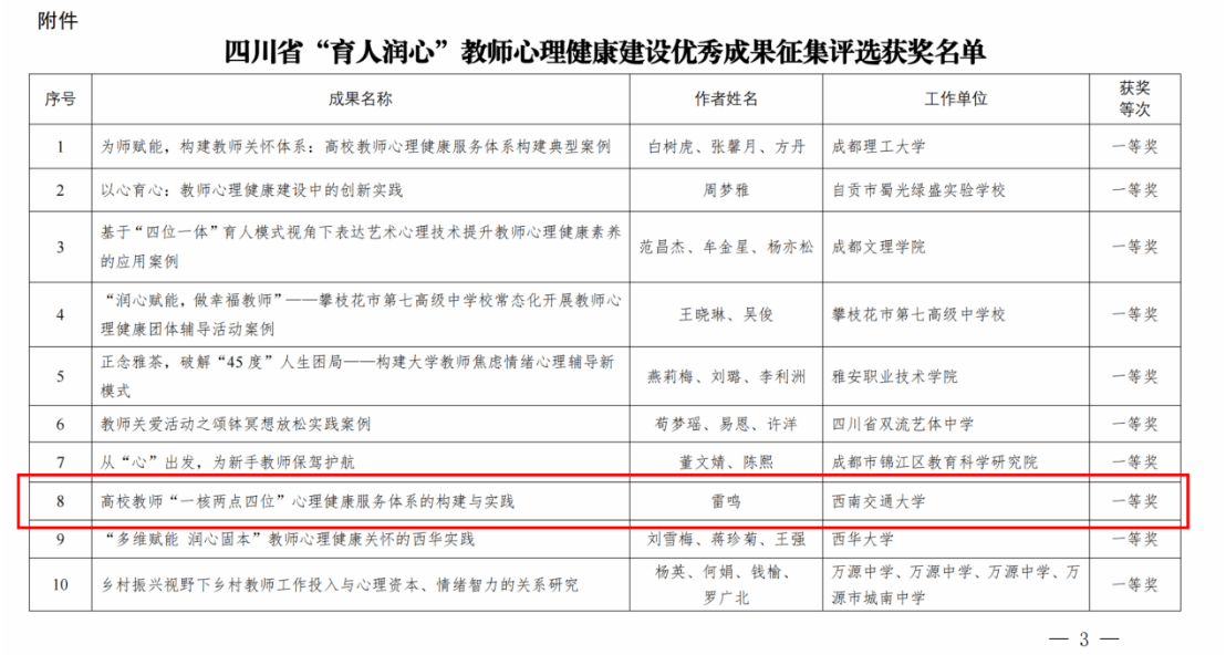 近日,四川省教师发展中心、四川省教育学会教师发展分会专涵公布了“育人润心”新时代教师心理健康建设优秀成果征集评选活动的获奖作品名单。中心教师雷鸣、高雪梅、冯缙、杨兴鹏、孙辰立申报的三项作品从1256项参赛作品中脱颖而出,喜获一等奖1项、二等奖2项。