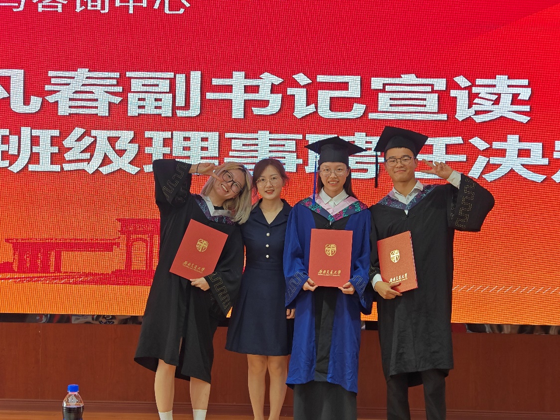 接下来,刘咏梅书记、雷鸣副主任为2024届优秀大学生毕业生颁发荣誉证书并合影留念。分团委书记樊菊颁发年级/班级理事聘任证书。