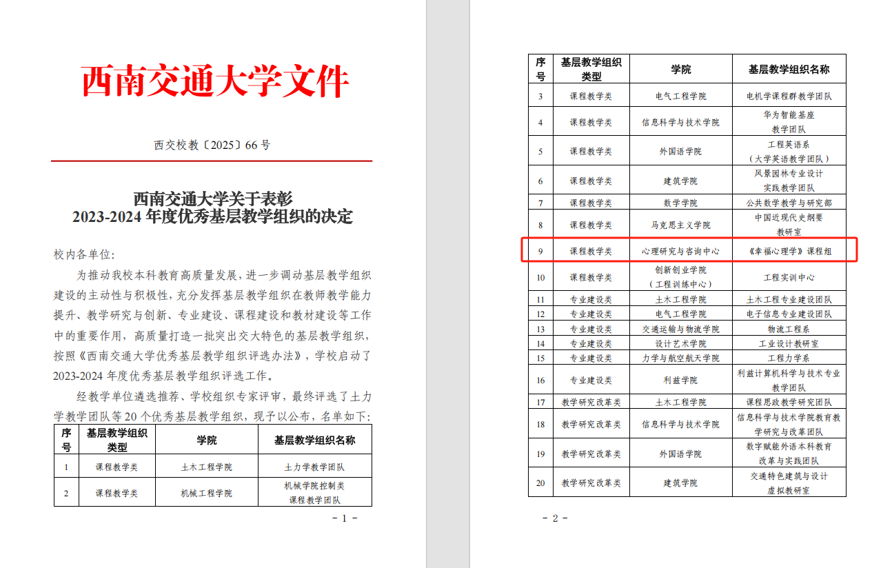 优秀基层教学组织评选办法》(西交校教〔2025〕21号),学校启动了2023-2024年度优秀基层教学组织评选工作。经教学单位遴选推荐、学校组织专家评审,最终评选出土力学教学团队等20个优秀基层教学组织。《幸福心理学》课程组获评优秀基层教学组织。