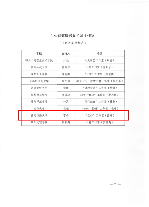 “正心”工作室(雷鸣)获批四川省高校思想政治教育名师工作室(四川省心理健康教育名师工作室)