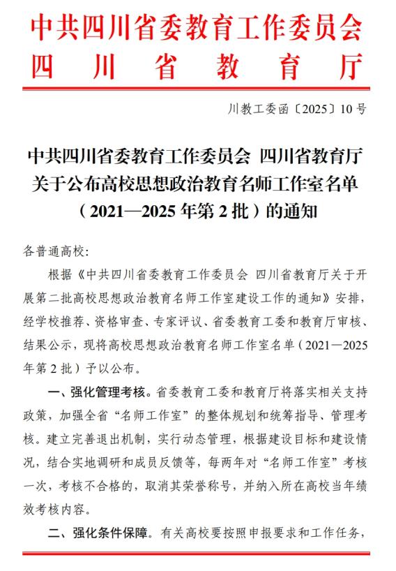 中共四川省委教育工作委员会、四川省教育厅公布了高校思想政治教育名师工作室名单(2021-2025年第2批),中心雷鸣副教授主持的“‘正心’工作室”入选四川省心理健康教育名师工作室。