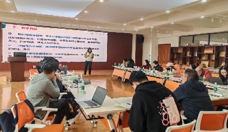 赵轶群、高飞、唐静三位老师代表各自小组向所有参会教师展示分享课程内容安排、教学资源的选择、活动的设计等。