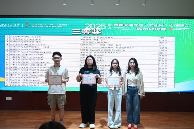 经过激烈角逐,建筑学院城乡规划2022-01班、信息科学与技术学院轨道2024-01班摘得特等奖,公共管理学院法学2024-02班等3个班级获一等奖,交通运输与物流学院交运硕士2024-10班等5个班级获二等奖。智慧城市与交通学院智能建造2024-02班的张思雨、建筑学院城乡规划2022-01班的张雯琦、公共管理学院法学2024-02班的马尔丹·别克加沙尔分别获得心理委员最佳个人风采奖、最佳创意策划奖、最佳宜人亲和奖。