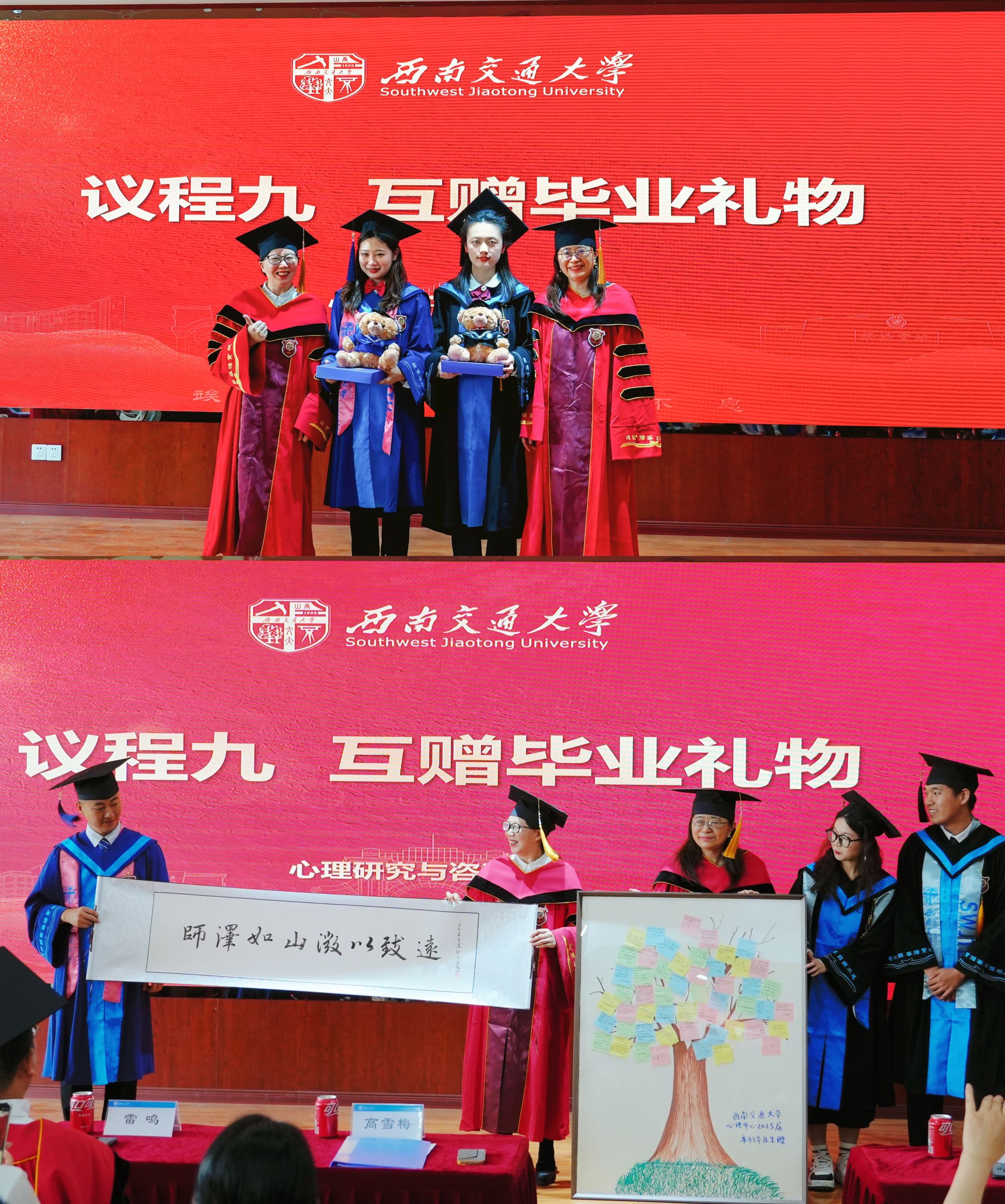 毕业生们也用独特的方式回馈母院:研究生们送上一幅手书卷轴——“师泽如山,微以致远”,这是学子对中心办学的高度肯定;本科生则将每个人对中心的祝福语拼接成一幅画,祝愿中心枝繁叶茂,生生不息。这两份饱含心意的礼物让现场温情涌动。