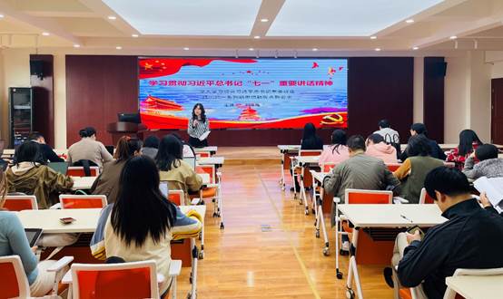 议程一,刘咏梅书记对习近平总书记“七一”重要讲话精神进行了全面解读,带领大家深入学习领会了习近平总书记重要讲话提出的一系列新思想、新观点、新要求,并对“七一”讲话的主要内容和思想精华做出了6个方面的分享并总结。刘书记强调,希望中心师生深刻把握伟大建党精神这个精神之源,紧密结合工作实际,不断深化对“七一”讲话精神的理解领悟,真正学深学透、融会贯通,立足个人岗位,在学思践悟中总结经验、观照现实、推动工作。青年学生要深刻领会“七一”重要讲话精神,用知识武装头脑,用思想指导实践,把伟大建党精神继承下去,发扬光大,为新的百年征程贡献自己的力量。