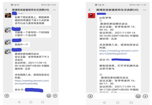 咨询部及时启动疫情应急预案,迅速调整工作模式。从10月29日,开始启用线上咨询,咨询老师和来访者通过腾讯会议进行咨询。通过这种方式,可以让有需要心理帮助的同学能够及时进行咨询。这期间,根据学校疫情防控的相关要求,老师们行程小心谨慎,多次参加核酸检测,并克服在工作学习中的各种困难,保证咨询工作正常有序的开展。
