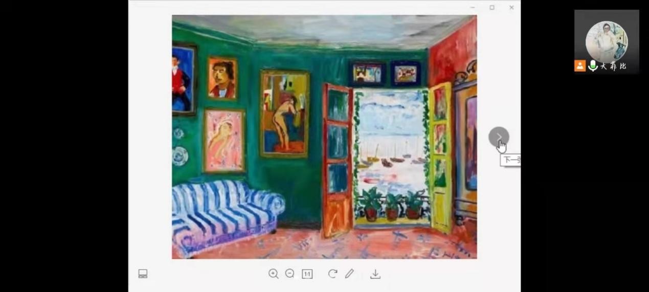讲座伊始,冯缙老师向我们解释了什么叫“意象绘画”。她说:“画画不是用手,是用眼睛。眼睛向外看,看到外界事物;眼睛向内看,看到自己内心感受。”冯缙老师指出,意象绘画的作用主要是开发感受力。紧接着,冯缙老师以博纳尔、马蒂斯等画家的画为例,让听众不单单是用眼睛欣赏画作,而更是用心来感受画作。