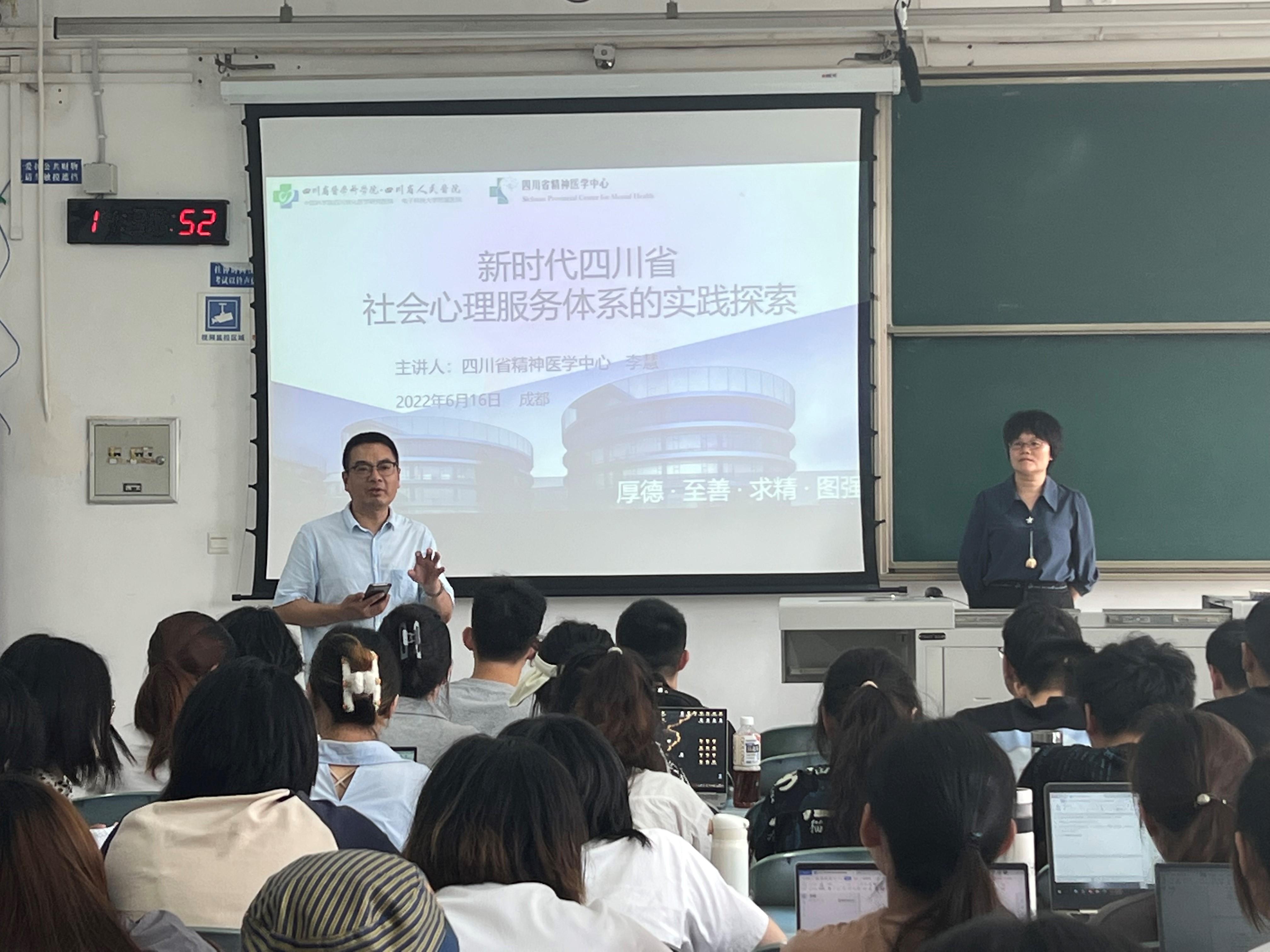 2022年6月16日下午14:30,四川省精神卫生项目办执行主任、四川省精神医学中心公共卫生办公室负责人,四川省人民医院精神科副主任医师、心理治疗师李慧老师应邀前来中心为2021级、2020级、2019级应用心理学专业本科生在犀浦校区2335举行讲座。李慧主任结合四川省社会心理服务体系试点城市绵阳、自贡以及自己的工作实践,为同学带来了题为《新时代四川省社会心理学服务体系的实践探索》。讲座由中心分管教学的副主任雷鸣老师主持。