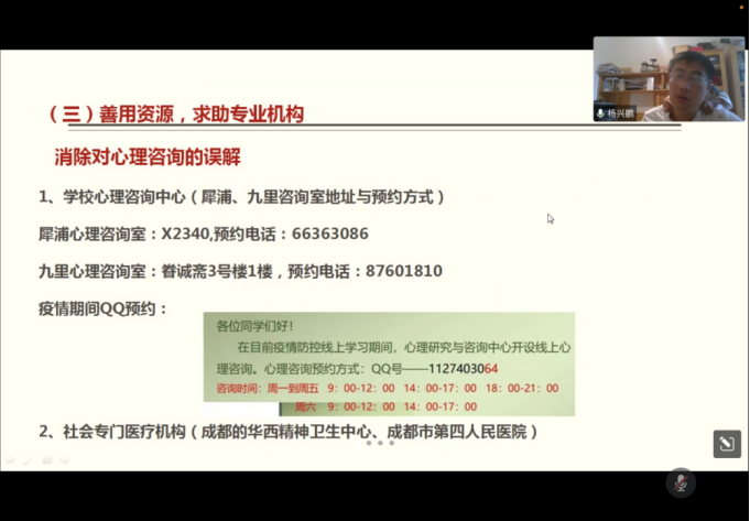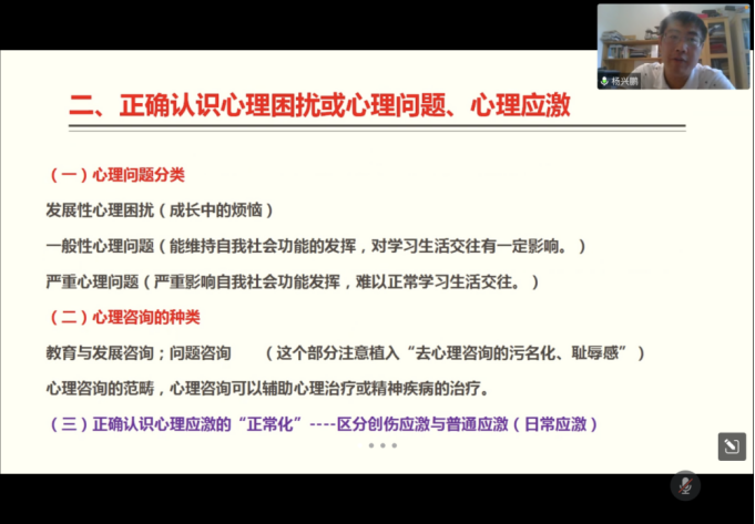 讲座开始,杨老师以疫情防控下的昨日地震事件引入,与同学们积极互动,关心安抚同学们的心理。