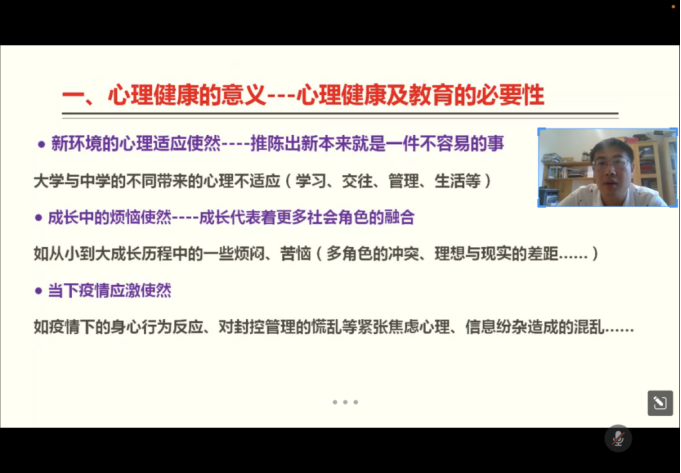 接着杨老师从心理健康的意义方面告诉我们身心健康的重要性,并以疑病症和某同学肠应激综合征为例论证心理健康对身体的影响,说明身体和心理是相通的,要注重我们的心理问题。杨老师希望我们能重视自己的心态并思考自己该如何成长,从心理健康的必要性鼓励大家要有自信,并举自己从刚到重庆的不适应到现在完全适应的例子鼓励同学们要努力适应大学生活。杨老师指出,在成长阶段我们会扮演很多不同角色,我们不应去逃避责任。面对疫情,杨老师告诉大家不必感到紧张焦虑,把日常防护措施做好,甄别信息的真伪性,相信自己是安全的。针对大学生容易出现的心理问题,如理想和现实的矛盾独立等,杨老师提出针对性的解决办法,并指出我们要学会自我调整,与同学老师交流,希望同学们能互相帮助,一起度过大学生活。