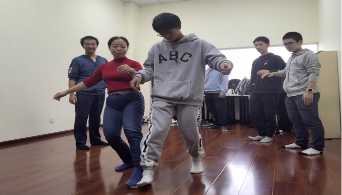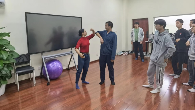 介绍完毕后,同学们互相认识了,高飞老师便带领同学们进入下一阶段的活动。首先是在音乐中闭上双眼,凭借感官找寻自己的搭档,接着和搭档面对面进行“眼神交流”与“身体部位绑定”活动。