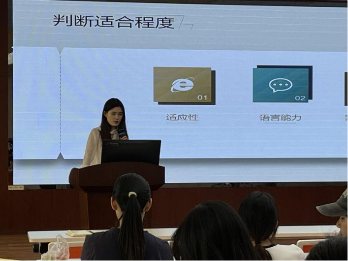 接下来是选择出国的2019级同学黄奕莛分享出国的经验。黄同学在判断出国留学的适合程度、申请的时间线、需要准备的文书材料、院校选择等方面提出实用经验和建议。