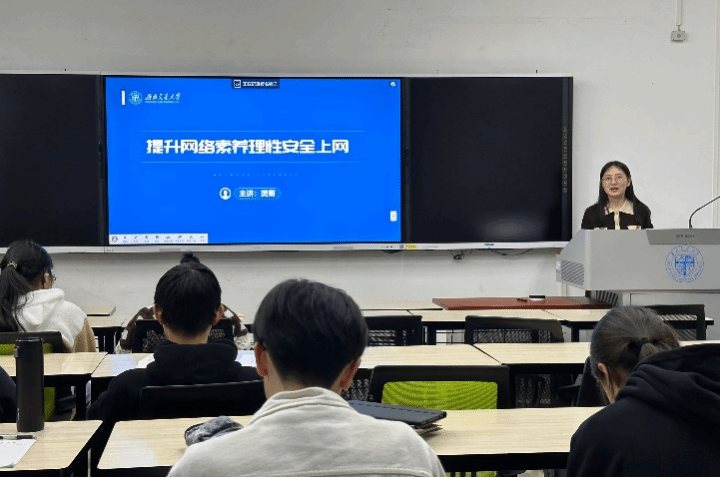 2023级本科新生于x2436教室开展“规章制度和网络安全”主题讲座。辅导员樊菊担任主讲人,2023级本科新生全员参与。